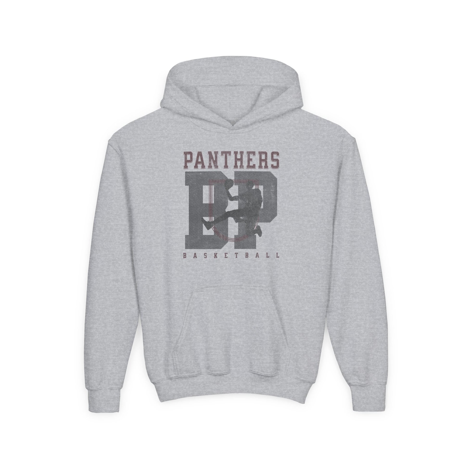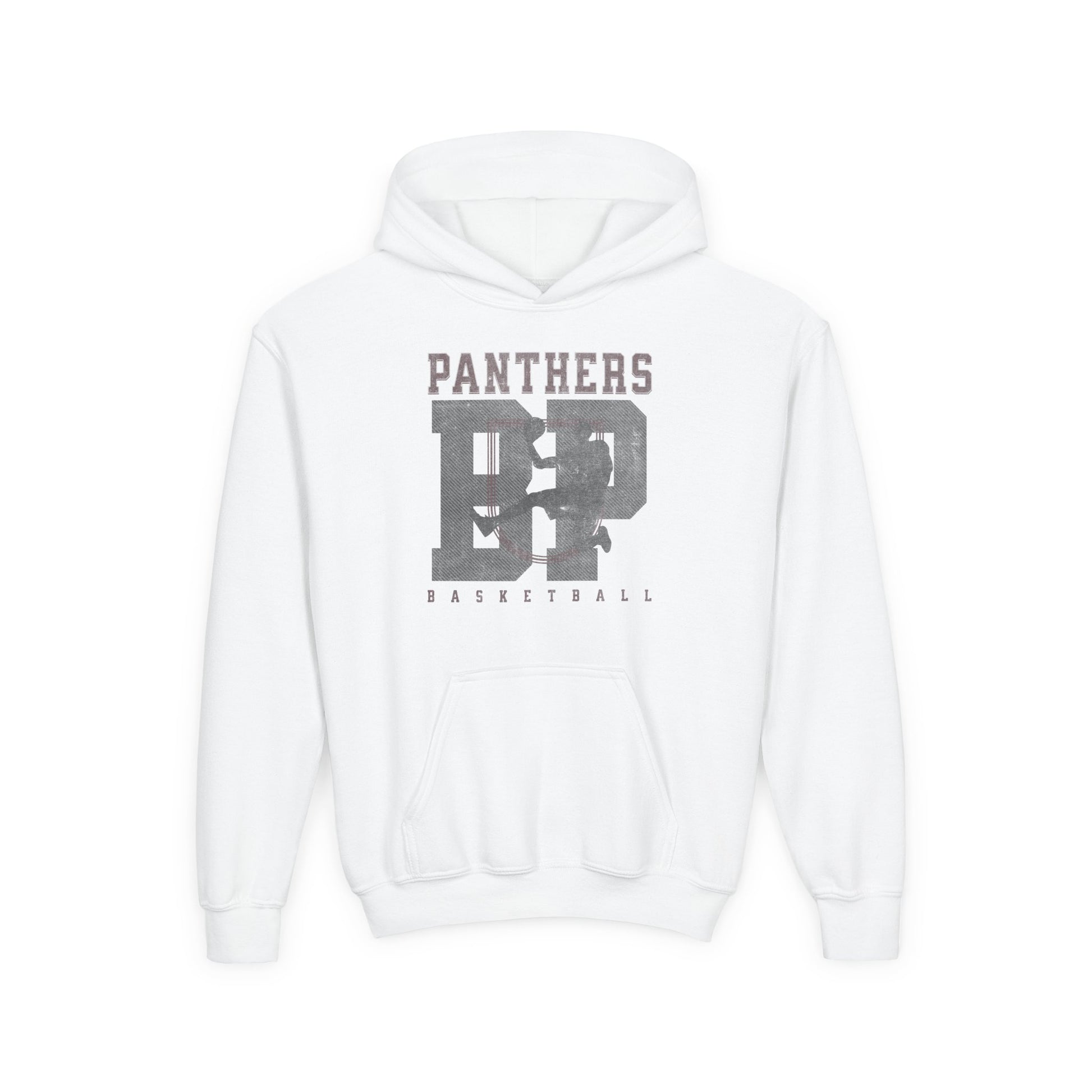 This cozy youth hoodie brings game-day energy and everyday comfort together. The front features a distressed “Panthers” and bold jersey-number graphic with a subtle “basketball” script beneath, giving it a worn-in, athletic look that kids gravitate toward. Midweight fleece holds up through practices, school days, and weekend hangouts while the roomy kangaroo pocket keeps hands warm and small essentials close. Thoughtful construction—twill necktape, sewn-in label, and clean ribbing—keeps the fit stable and wearable after repeated washes. Available with optional left- or center-chest embroidery and printed wrist details, it’s built to look like part of the team right away.