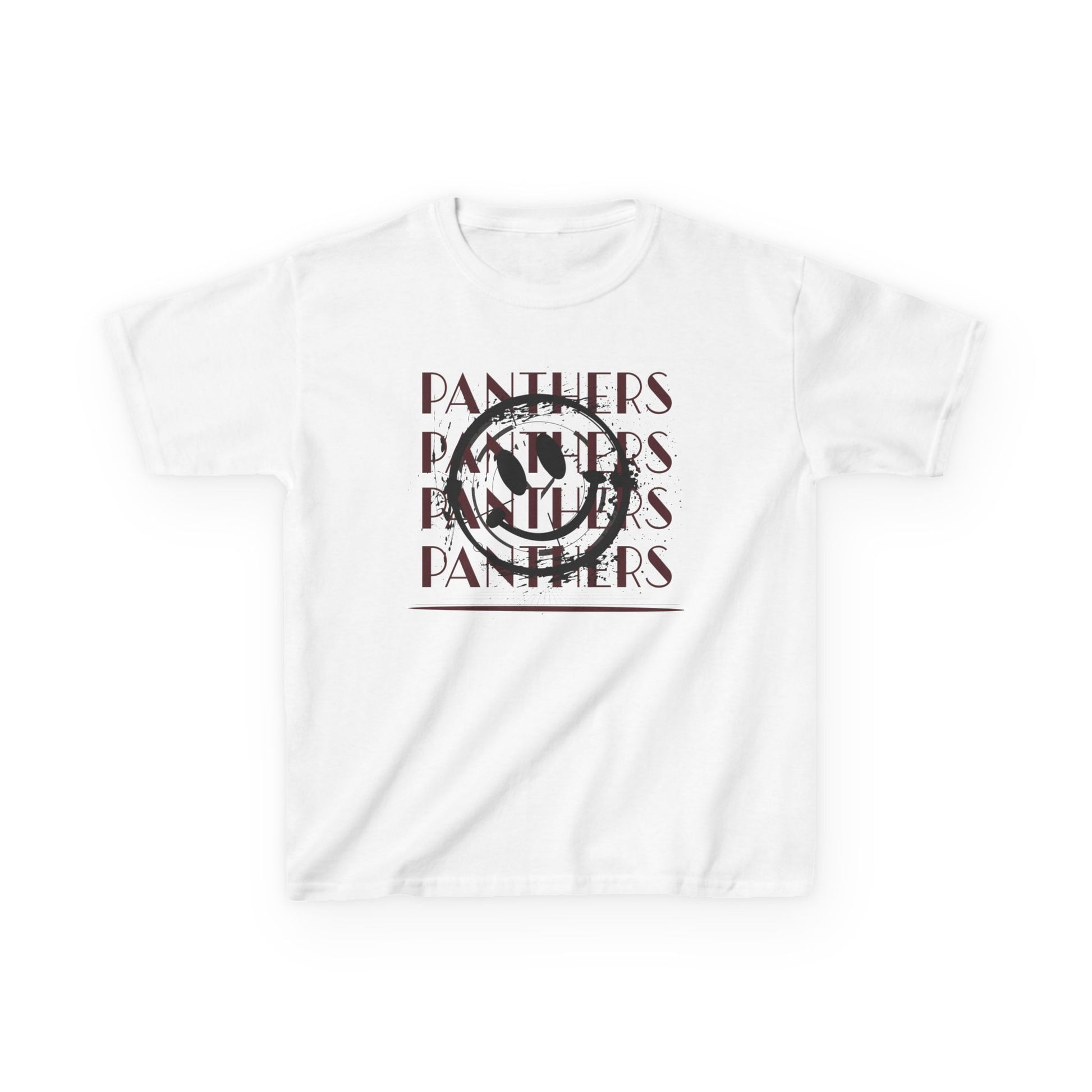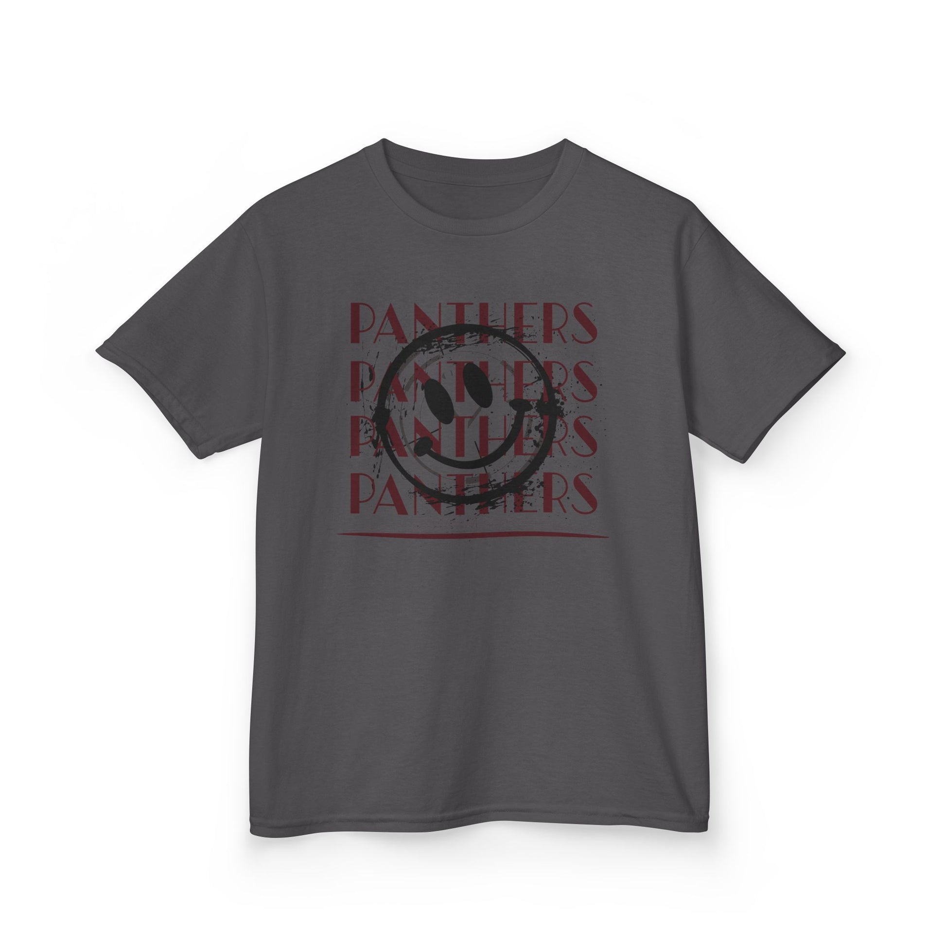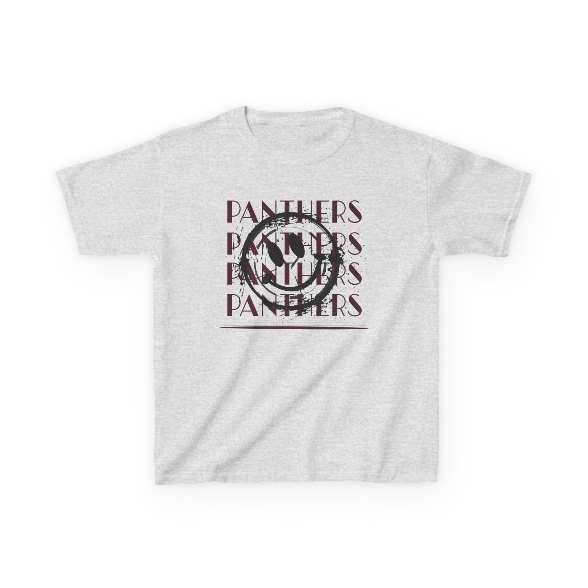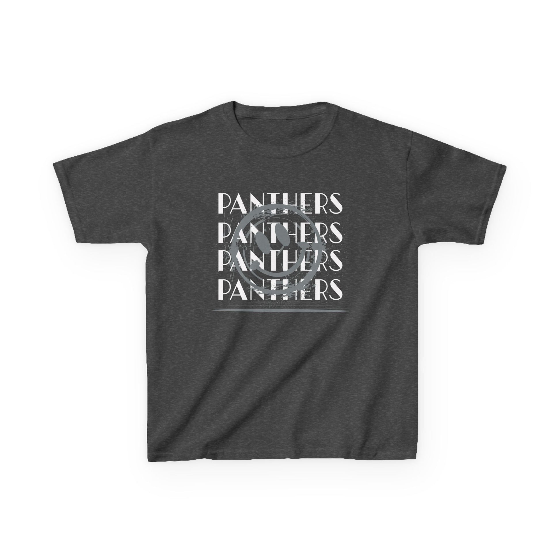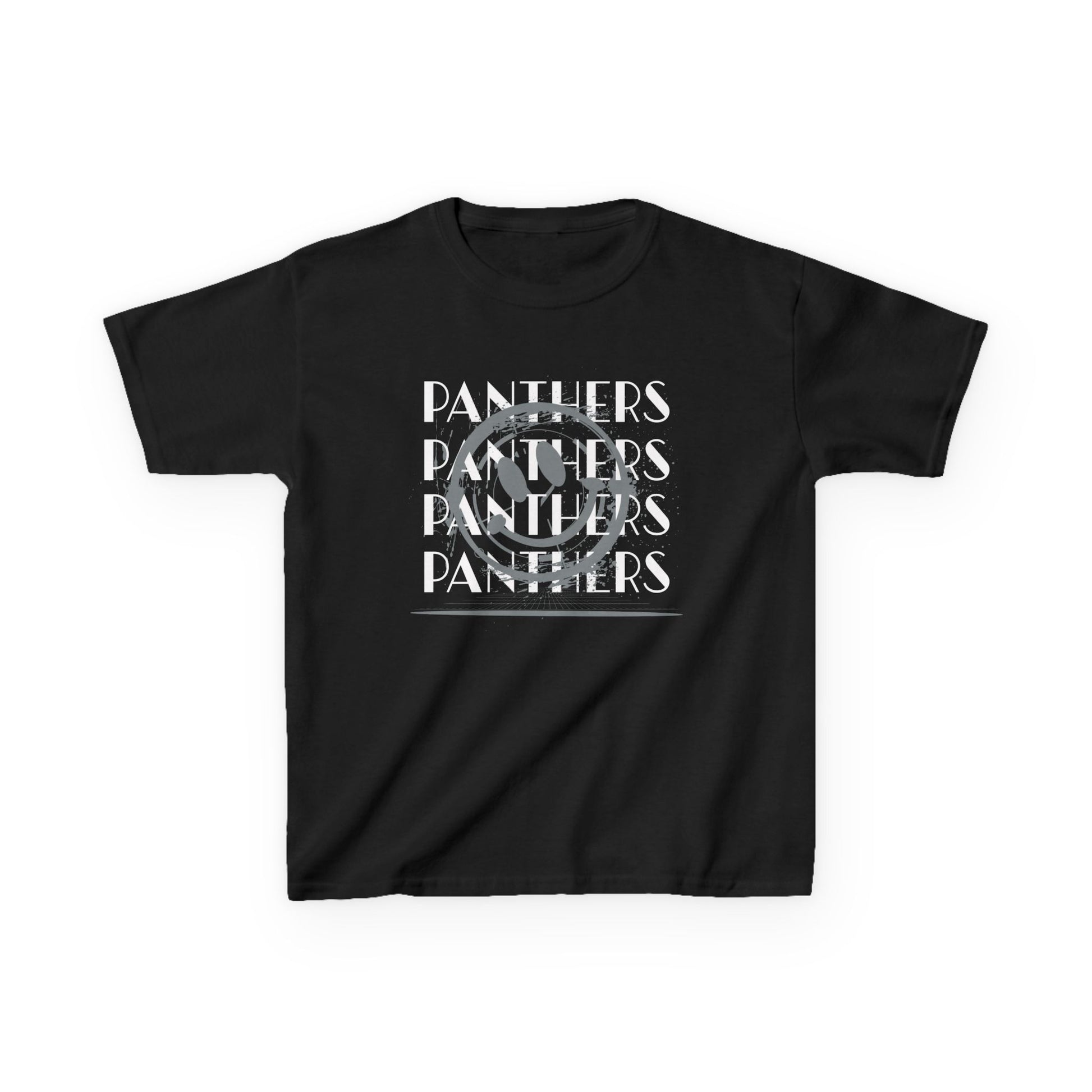 A soft, season-round tee made for kids who carry team pride on their sleeves — and across their chests. The classic crew neck and timeless fit let this shirt move with them from classroom to backyard practice. A layered, slightly distressed “PANTHERS” repeat sits behind a bold circular panther motif, giving the design a vintage-sport energy with a modern graphic edge. Lightweight but durable midweight cotton keeps the shirt comfortable through play, while reinforced shoulder tape and a ribbed collar hold shape after washes. This is a kids’ tee that looks lived-in right away and stands up to everyday adventures.