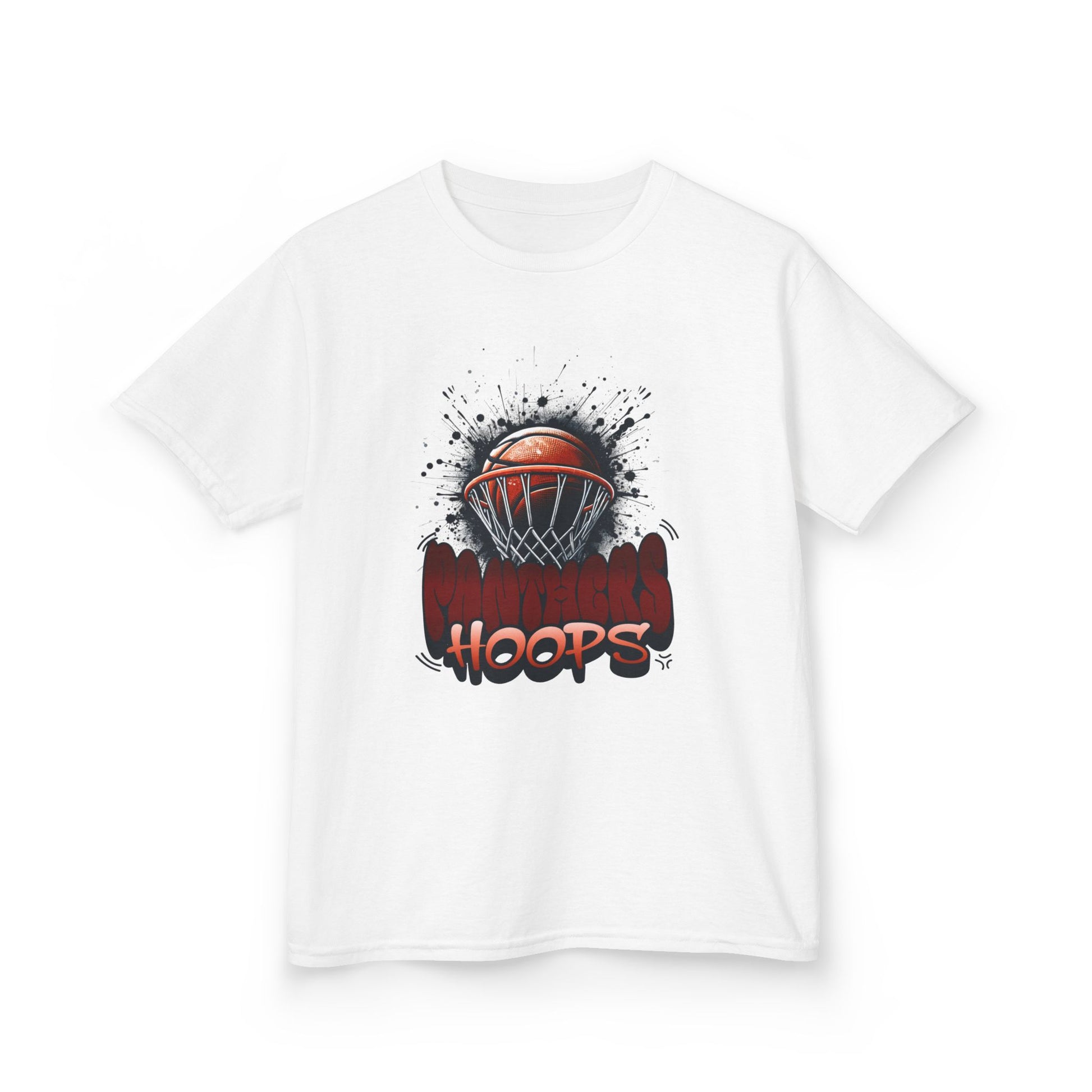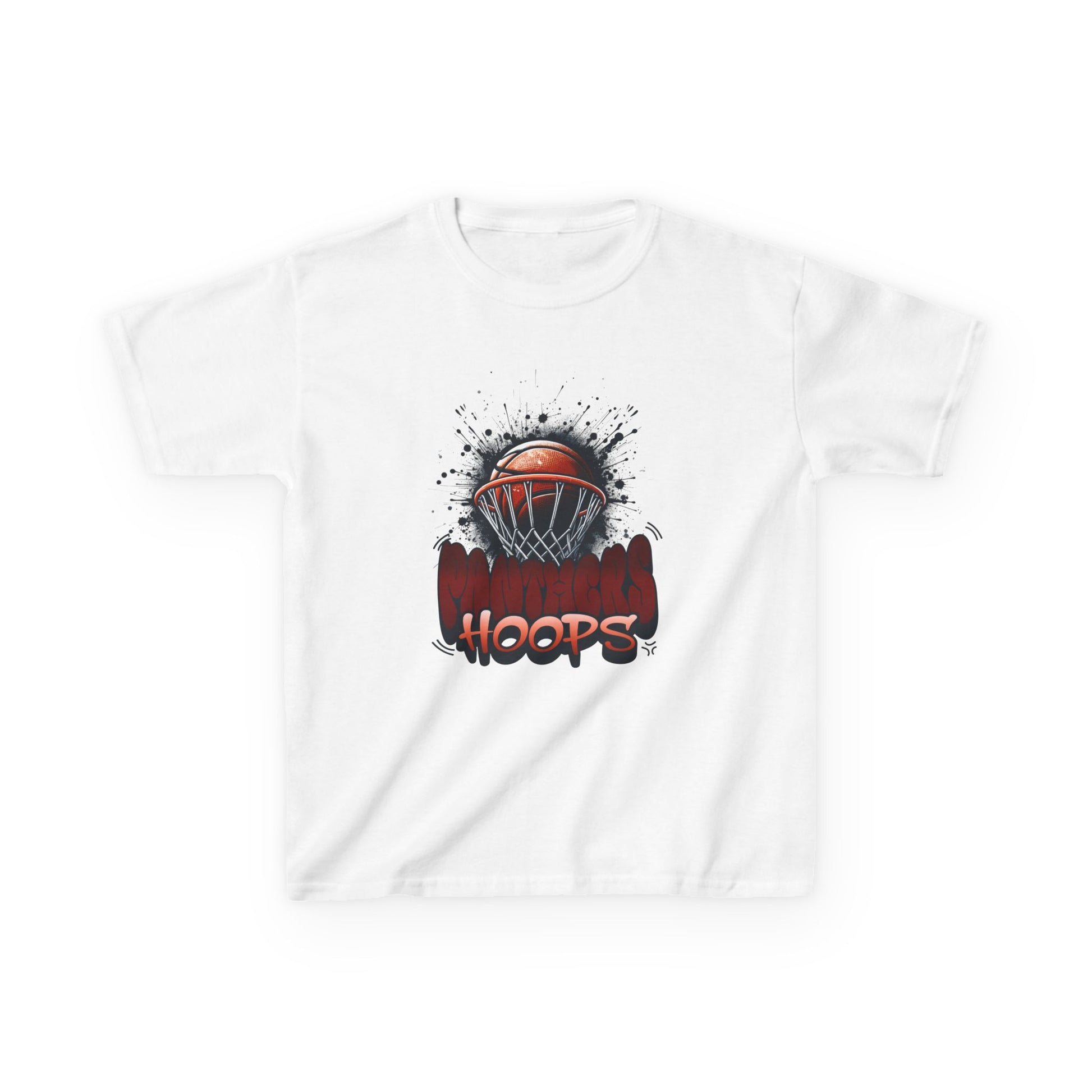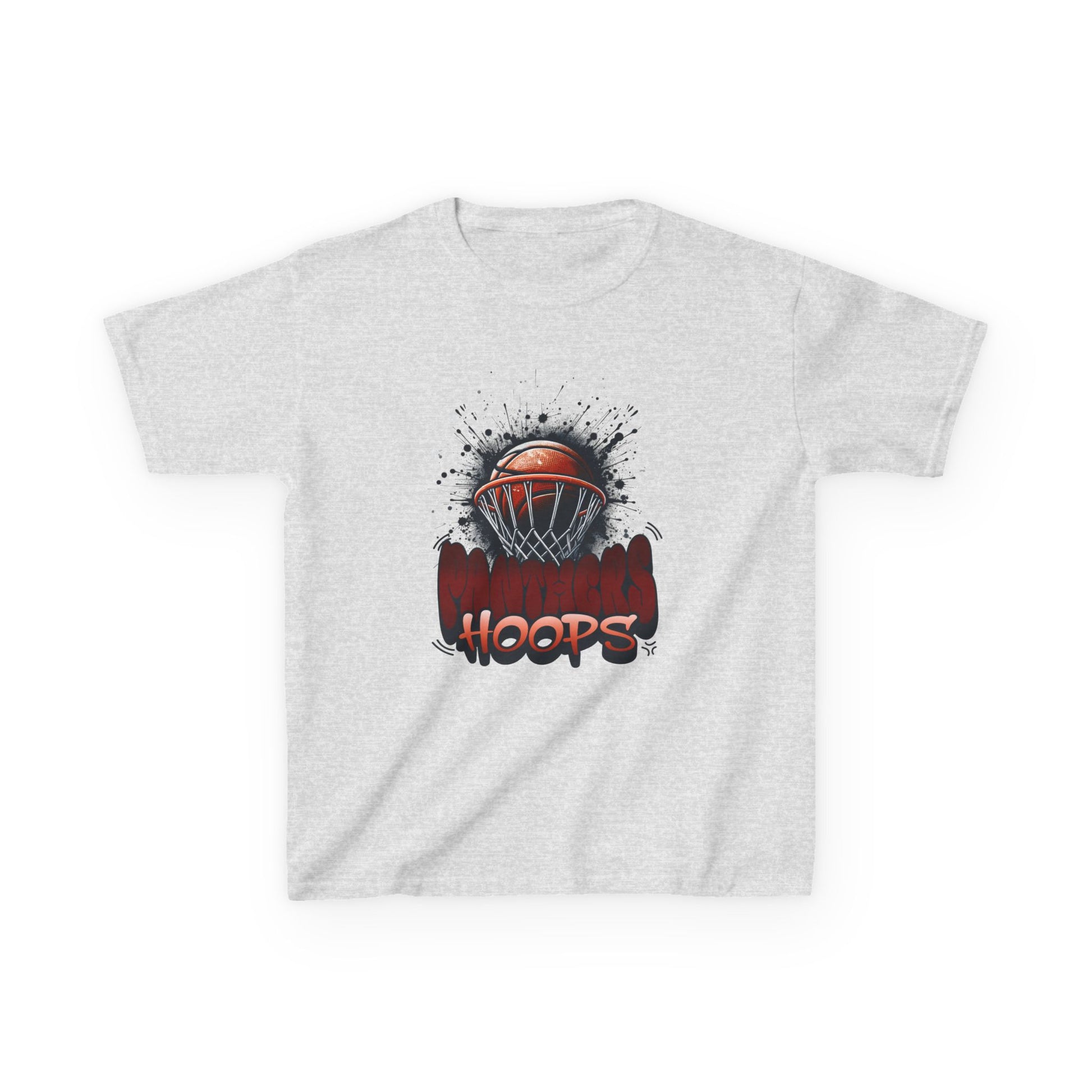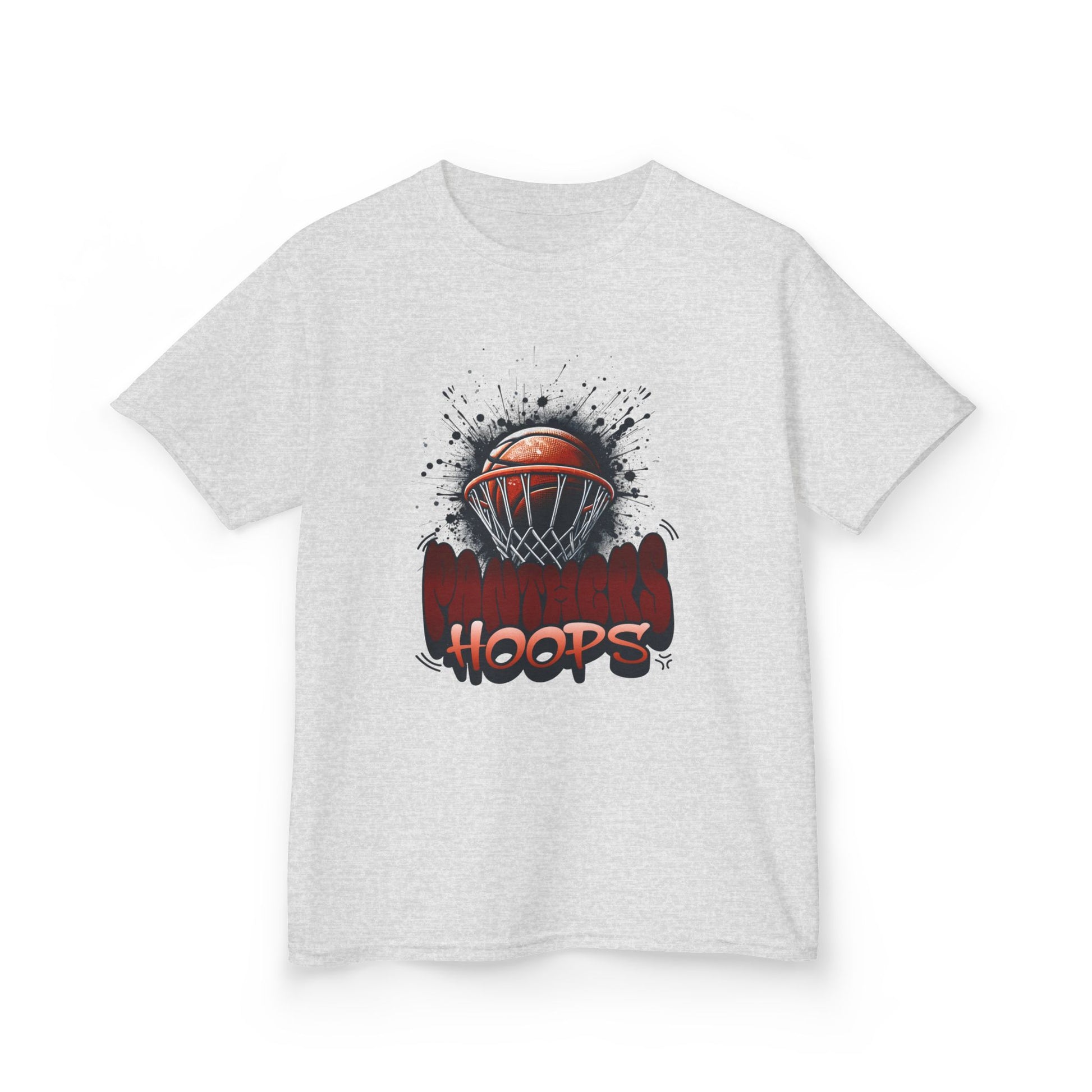 Small hands, big dreams — this kids tee brings the thrill of the court to everyday play. A bold, graffiti-style basketball graphic breaks through the center, paint-splatter details and a dripping “Hoops” tag adding movement and attitude. The midweight cotton keeps it soft and comfortable from practice to recess. It sits with a classic crew neckline and a timeless fit that layers easily under hoodies or over long sleeves. Let them wear their game-day energy any day of the week — whether shooting around at the park, cheering from the sidelines, or hanging out with teammates.