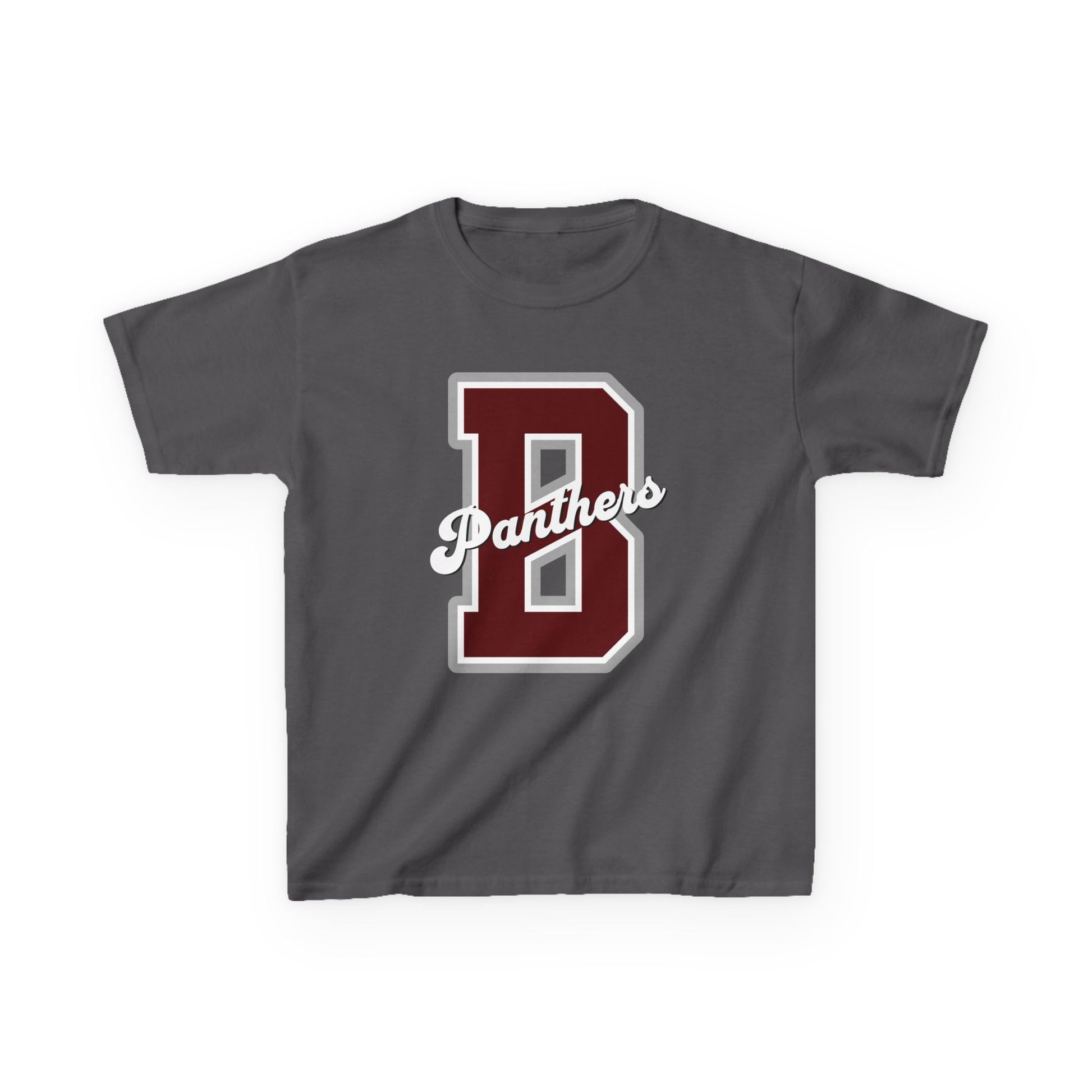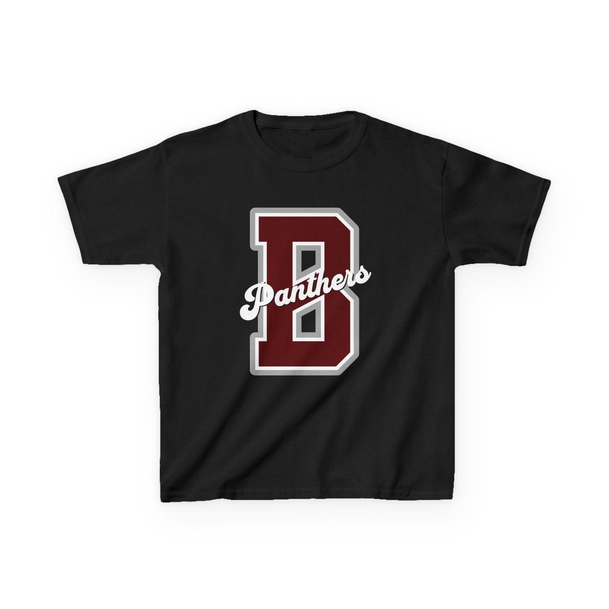 A soft, midweight kids tee that carries a classic varsity vibe. The front features a bold block “B” in deep maroon with a layered outline and a scripted “Panthers” sash that feels like a school‑spirit patch. Knit in one piece for a smooth finish and built with a ribbed, shape‑retaining collar and shoulder tape for durability, this shirt moves easily from playground to game day. Breathable US cotton keeps little ones comfortable through every season, while tear‑away pearlized labels prevent irritation. It’s made with sustainably grown cotton and meets Oeko‑Tex and REACH standards for safety and quality.